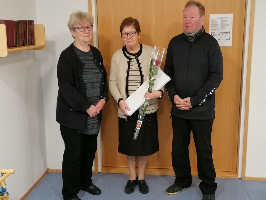 Yhdistyksen pitkäaikainen taloudenhoitaja Helena Mankkinen luopui tehtävästään keväällä 2021. Hallituksen hakemuksesta Aivoliitto myönsi Helenalle Aivoliiton viirin kiitokseksi pitkäaikaisesta työstä Mikkelin seudun AVH-yhdistys ry:n taloudenhoitajana. Viiri luovutettiin Helenalle Mikkelin AVH-kerhossa 7.9.2021 kiitospuheiden kera. Kuvassa viiriä luovuttamassa Helena Valkama ja Ismo Rahikainen. |