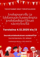 Torstaina 4.12. klo 13 - 15 Mikkelin alueen kaikki kerhot (AVH-kerho, Tarinakammari, Työikäiset ja Äijäkerho) kokoontuvat yhteisen puurokattilan ääreen seurakuntakeskuksen aulakahvioon os. Savilahdenkatu 20, Mikkeli. Ohjelmassa on joululaulujen laulamista Elina Kellmanin säestyksellä, joulupuuro ja kahvi nisun kera sekä tietenkin arpajaiset.