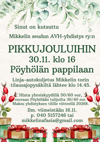 Ilmoittautuminen erityisruokavalioineen 15.11. mennessä mikkelinafasia@gmail.com tai p. 044 2118838. Pikkujoulut maksetaan yhdistyksen tilille OP FI66 5042 0020 0463 96 viitteellä 48295