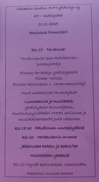 Vietimme yhdistyksemme 45-vuotisjuhlat tiistaina 11.11.2025 klo 17 alkaen Mikkelissä, ravintola Pormestarin tiloissa 44 osallistujan kesken. Juhlapuheen piti yhdistyksen puheenjohtaja Ismo Rahikainen. Saimme tilaisuuteemme tervehdyksen myös Etelä-Savon hyvinvointialueen hallitukselta. Tervehdyksen tuojana oli Pirkko Valtola Eloisan hallituksen 1. varapuheenjohtaja.